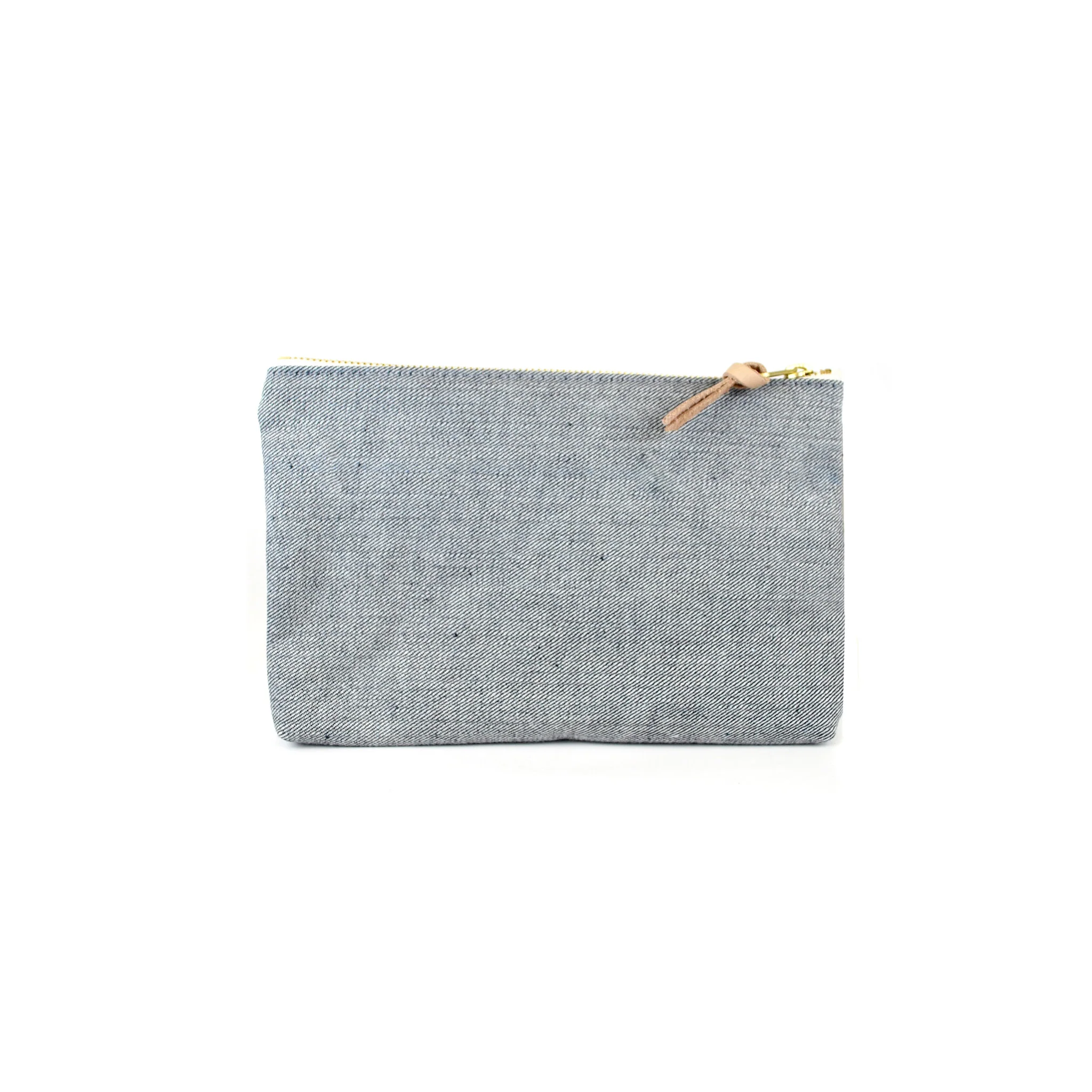 Material: Cotton denim, leather pull, and brass zipper