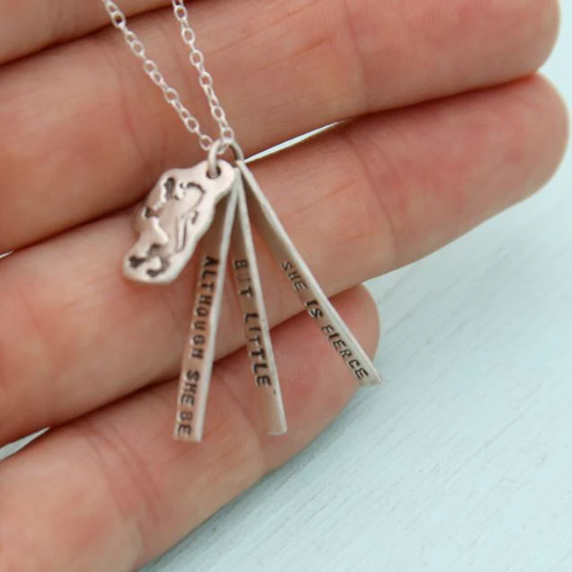 This handmade pendant necklace features a stirring quote from William Shakespeare's A Midsummer Night's Dream layered with a small lion charm. Carry with you the words of one of our greatest playwrights and poets and remember that strength comes in many sizes and shapes.